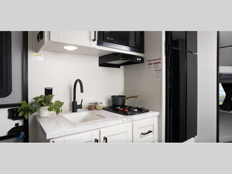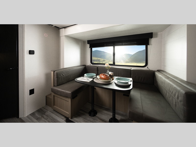 Each model is constructed with a Magnum Truss roof system, which is one of the strongest roofs in the industry, capable of withstanding 50% more weight. The axle(s) with electric, self-adjusting brakes and easy-lube hubs will make towing easier than ever, and the stabilizer jacks will give you peace of mind as you set up camp. Inside, you'll love the residential-style kitchen countertops and vinyl flooring throughout, plus there is an on-demand tankless water heater on board for hot water when you need it!